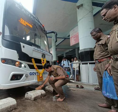 In the presence of Shri Mauvin Godinho Hon’ble Minister for Transport, Shri Ulhas Tuyenkar Hon’ble Chairman of KTCL, Shri Kritesh Gaonkar Hon’ble Vice Chairman of KTCL, Shri P. Pravimal Abhishek (IAS) Director of Transport, Goa, Shri Kapil Sardessai BoD, Shri Rohan Kaskar MD KTCL, Shri Mahendra Pednekar GM KTCL Shri Andrew Pereira DTO KTCL and others at Panaji Kadamba bus stand on the occasion of Dussehra 02/10/2025.